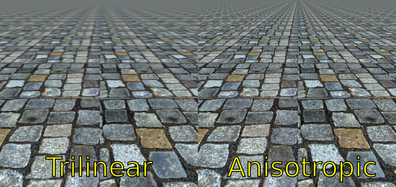 First off, we have the Texture Filtering Mode. What this option does is it manages the look of textures on objects (take for example a wooden floor) when you look at it from an angle. If set to the lowest setting, you might not even be able to tell that the floor is wooden because of artifacts and processing errors. A really simple way to show this is with digital characters. Here’s an image of texture filtering on a brick floor: