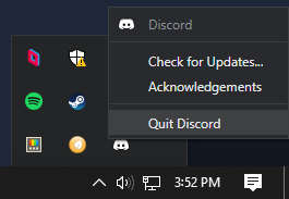 Clicking on this arrow opens up a box that shows icons of all programs in the tray. Usually, you can right-click to view information about the program, and close it as well. As an example, here’s Discord: