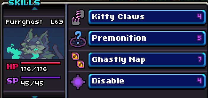 The piece de resistance and final part of the guide. For points, you’ll want to devote as much into HP and defense as possible. Since Kitty Claws is a really good damaging tool that doesn’t rely on offenses and Premonition has extremely high damage already, investing into offenses is a red herring and doesn’t offer anything. In addition more HP allows for more abuse of ghastly nap/soul swap (if you go that route), making it a much preferred option.