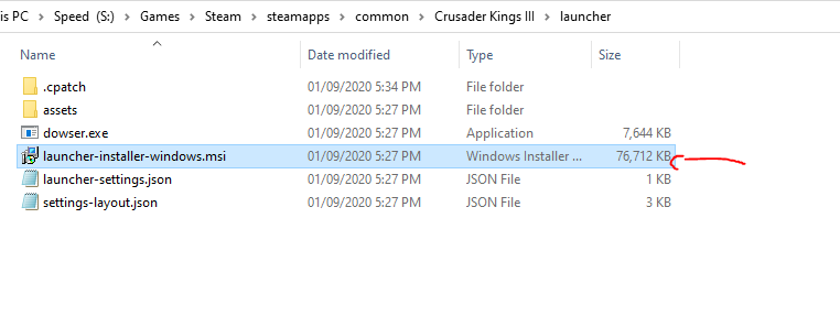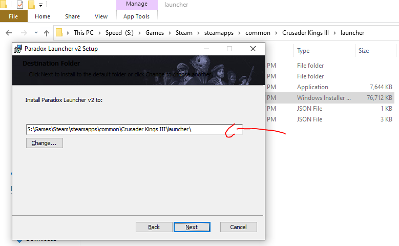 Click next and change the install path to the folder where you found the launcher-installer-windows.msi. It should look like this: S:\Games\Steam\steamapps\common\Crusader Kings III\launcher