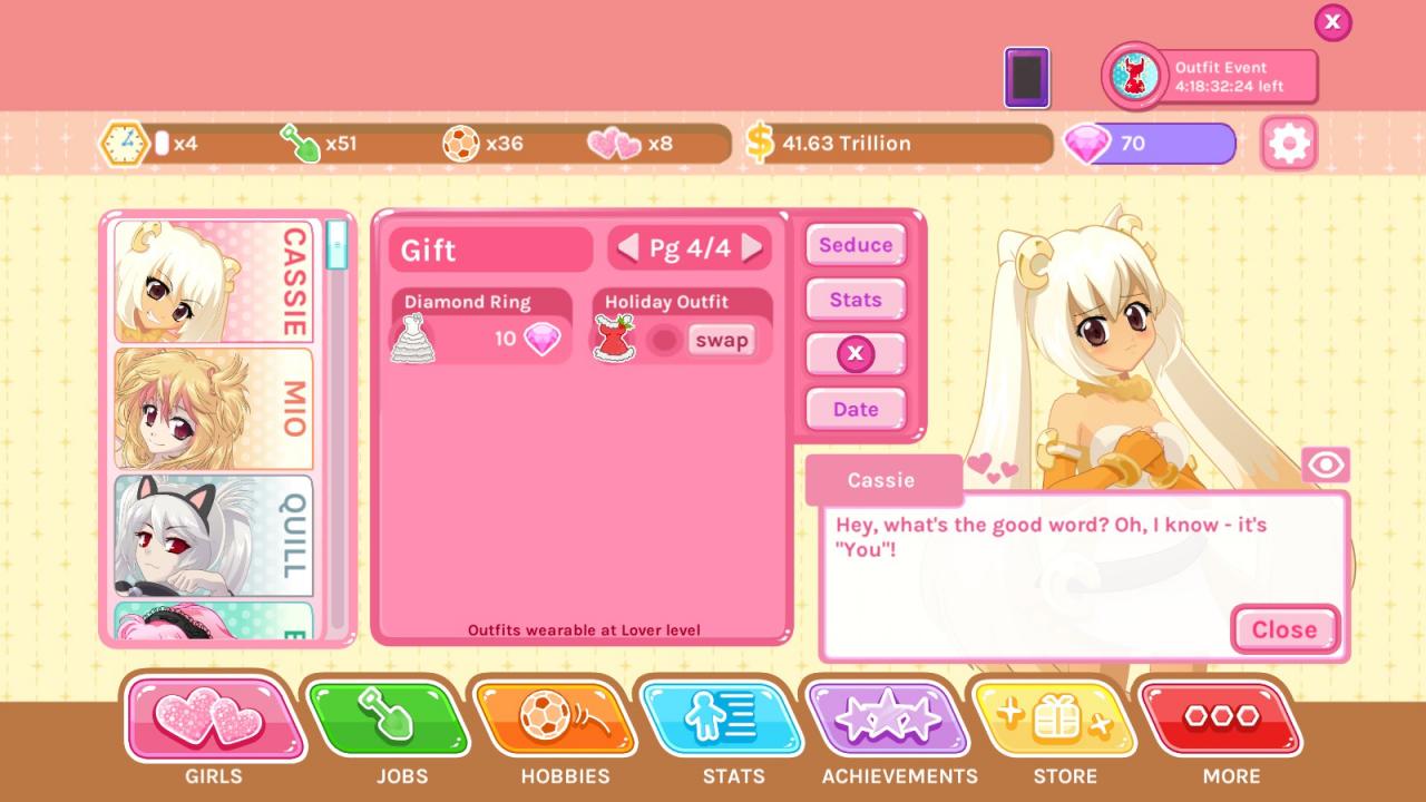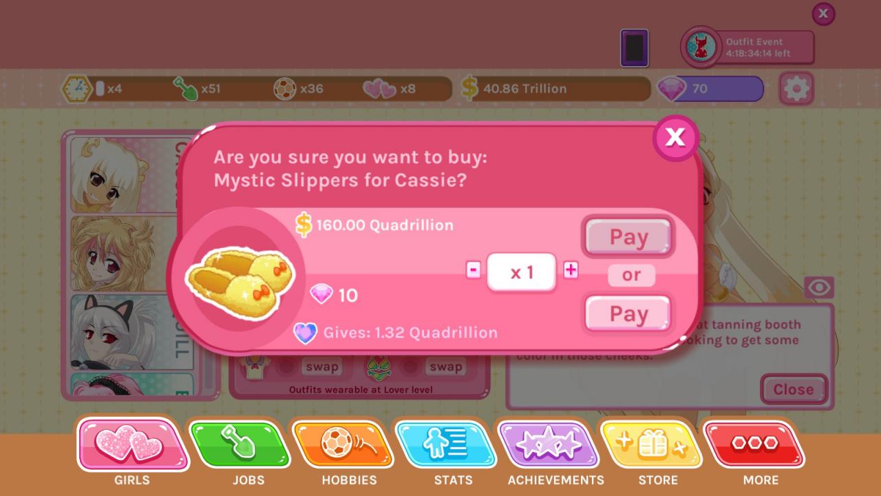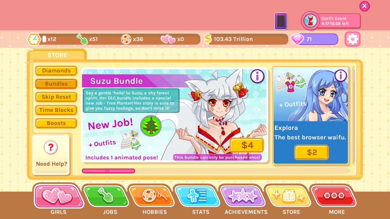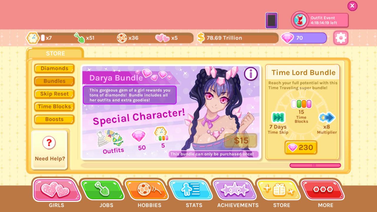 The main point of this game is meeting waifus and wooing them. As such, one of the best ways to spend your money in this game is on new girls to woo. The bundle girls come with bonuses such as jobs, speed dating, and in Darya’s case, diamonds, but these are all secondary to the most important part: new waifus to woo and spend time with.