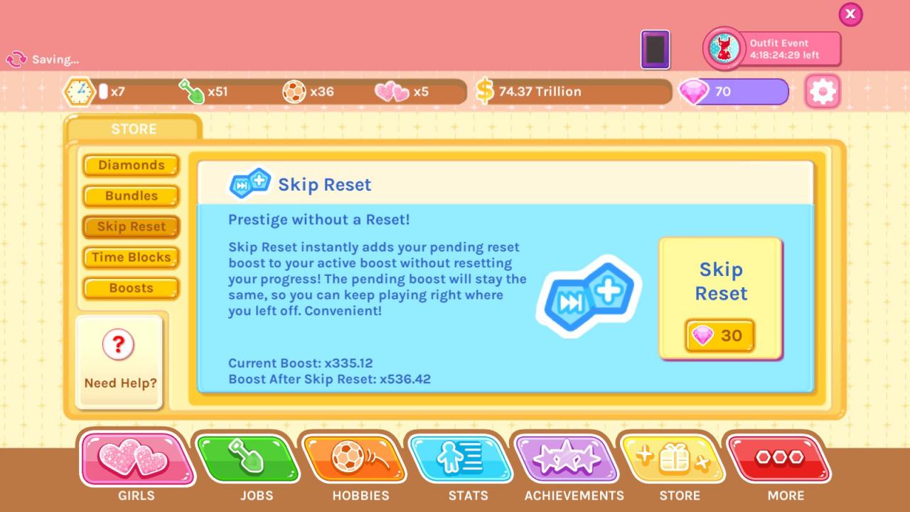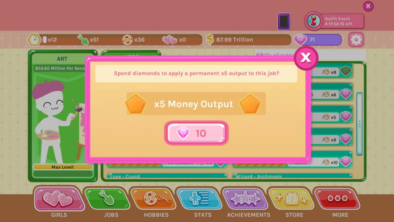 Unfortunately, this game is slightly pay to win. If you want to see all of the girls and/or this game’s ending, you’ll need to forfeit a bit of cold hard cash. It is going to take an astronomical amount of time to beat the game without Speed Boosts, and the x8192 multiplier makes it doable.