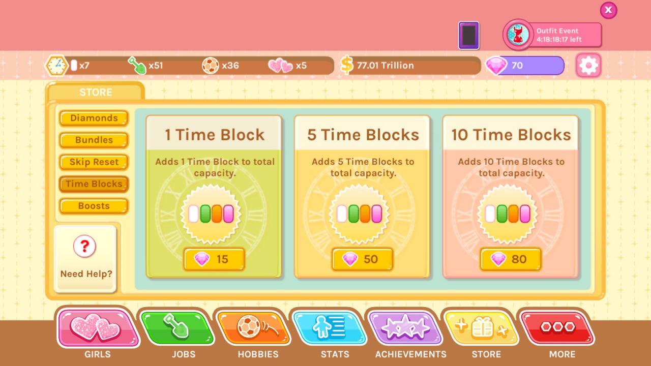 Not being able to do everything you want to do at once can be frustrating. But prioritizing and putting things on the back burner is a skill that this game demands of you. Eventually, you get to a point where you have an abundance of Time Blocks and can do everything you need to do at once. You can be patient and get to this point for free. If you spend your diamonds on Time Blocks, you’ll have an unnecessary excess down the road and fewer diamonds to spend.