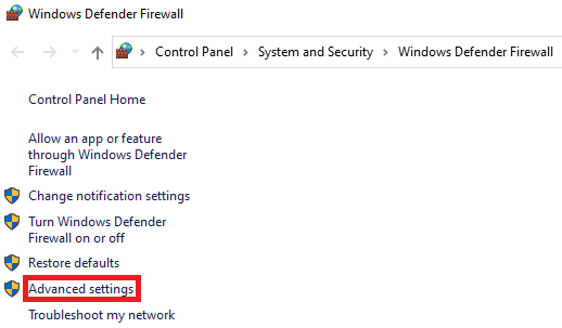 Open the windows firewall and navigate to the “Advanced settings”.