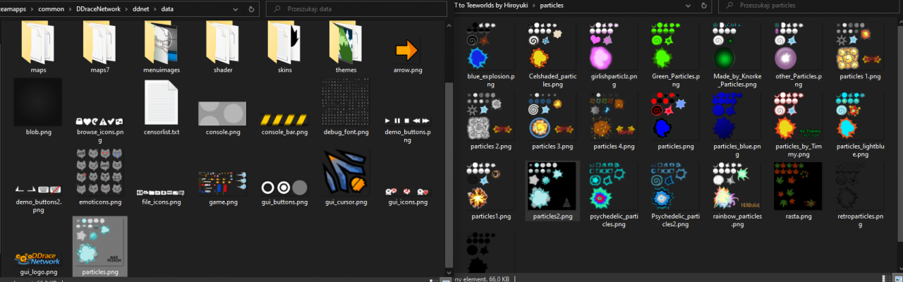 Open the “data” folder and the “particles” folder in the “TxT to Teeworlds by Hiroyuki” folder after that copy particles which you like paste this particles into “data” folder next delete file “particles.png”rename your pasted particles to “particles.png”