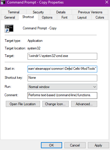 3.) Go to “Shortcut” in the Command Prompt Copy’s properties and find “Start in”