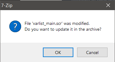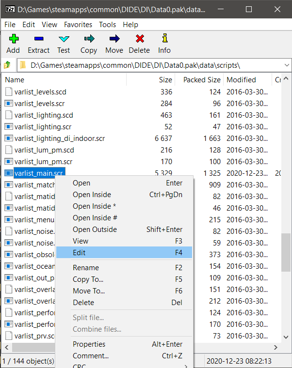 - In 7-Zip, open up the data directory, then the scripts directory and find the file varlist_main.scr. Right click on the file and select Edit.
