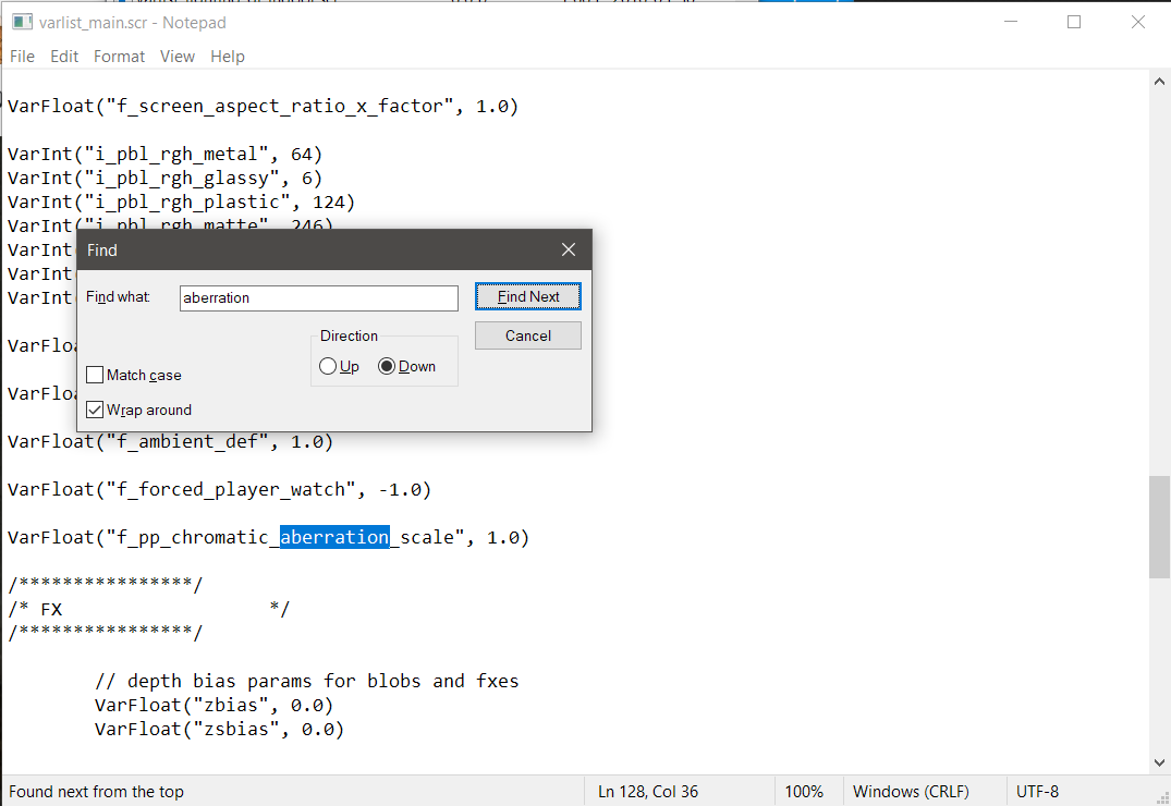 - This will open Notepad. Search for the phrase “aberration” to find the appropriate line.