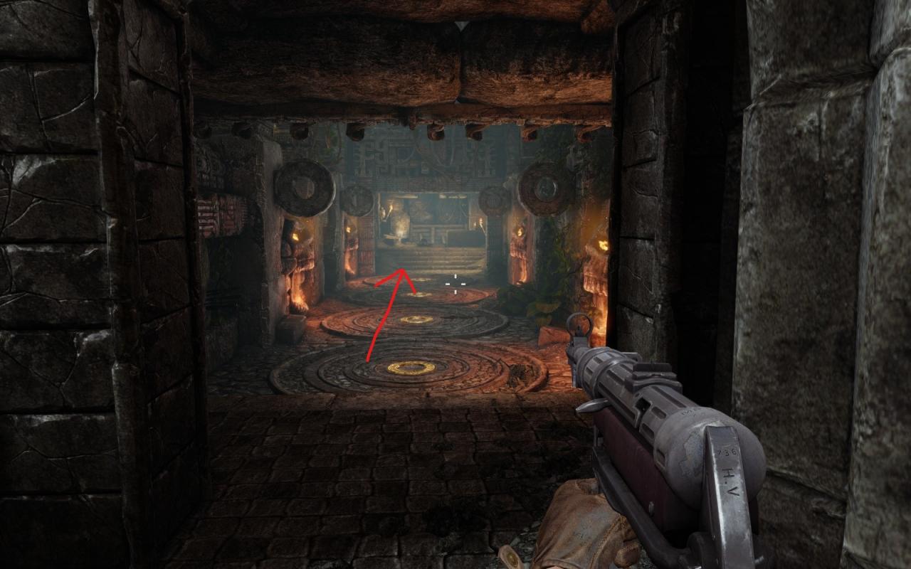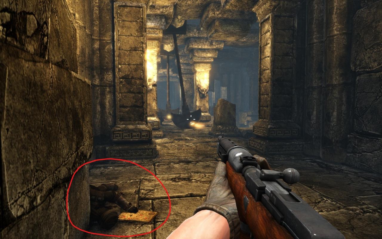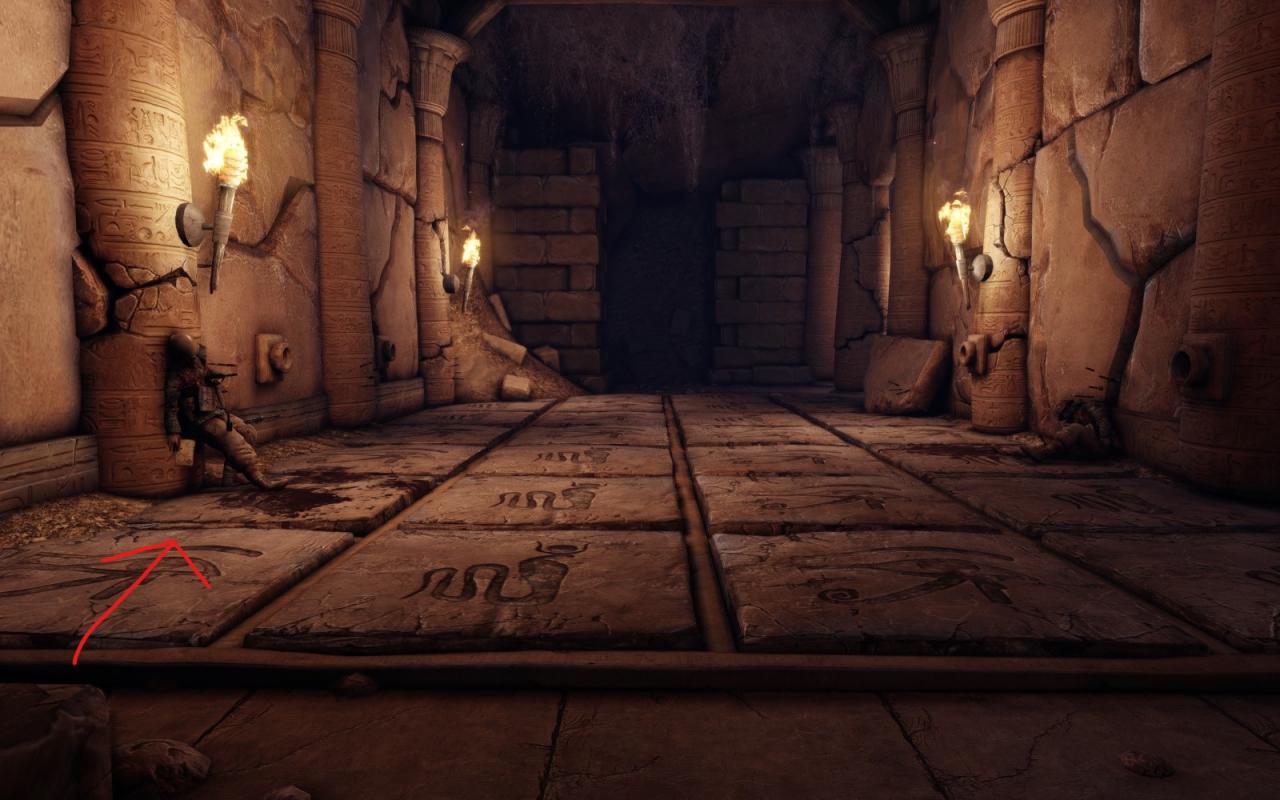 After inserting the Tear of Isis and watching a cutscene, you will start alone without any weapons. Use the left path and you will encounter the first trap. The map is being held by the body on the left. Step on the first tile from the left (remember that you can only step on the Eye of Horus symbols in this puzzle) but don’t go to far or you will end up the same as the dead guy in front of you. Try to reach the map as soon as the button shows up.