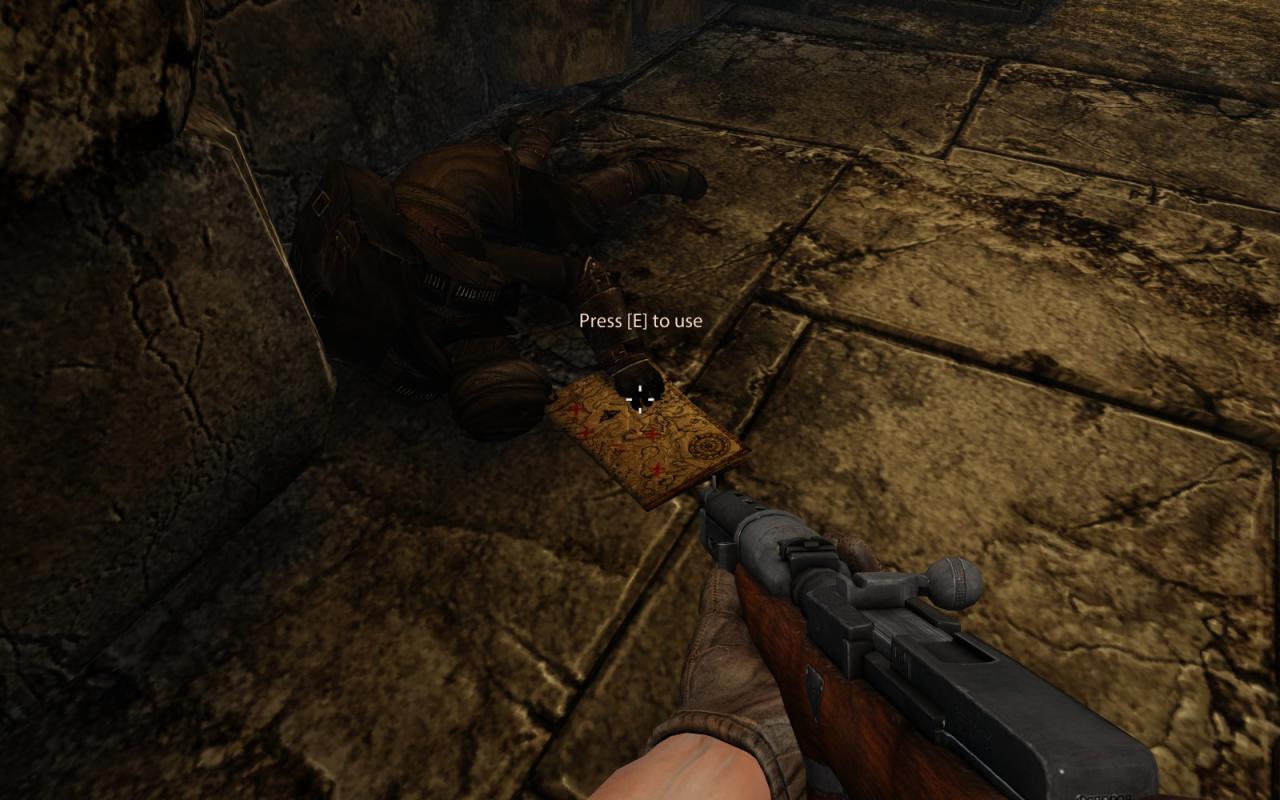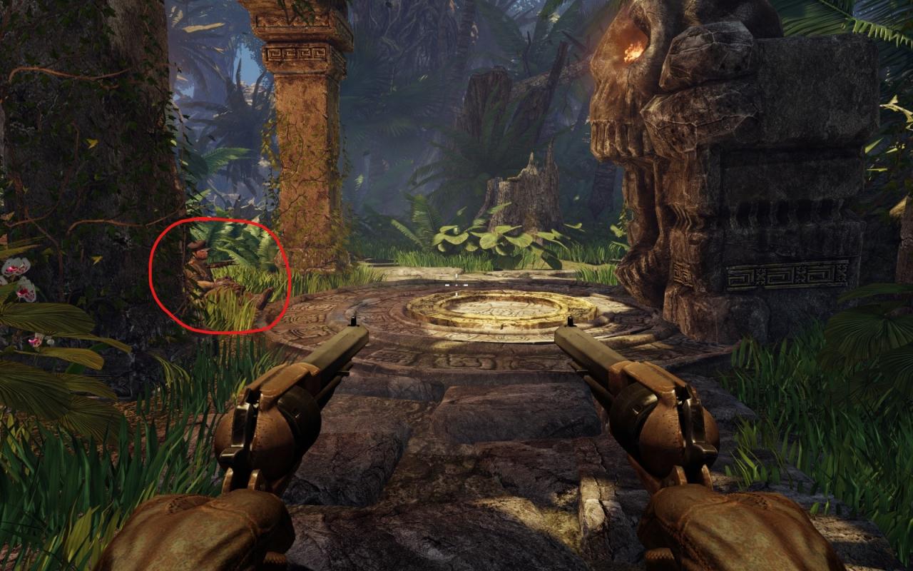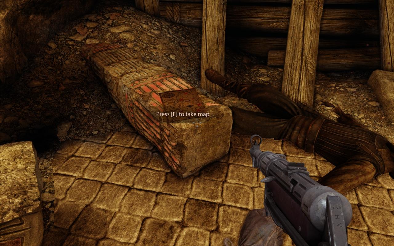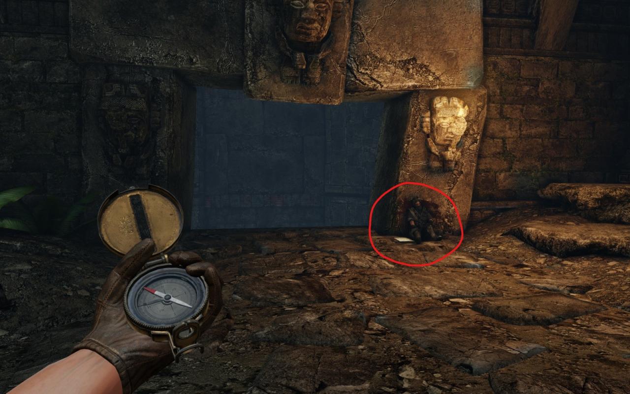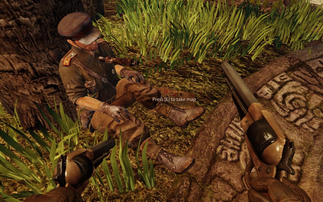 Proceed into the jungle from the starting location. Soon you will encounter first Mayan ruins with a trap inside. Next to a trap lies a body which is holding the map. Be careful not to step into the trap.