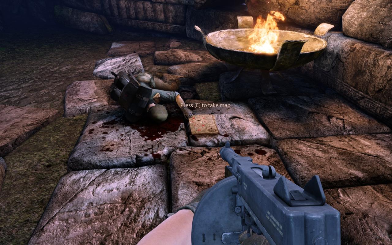 After the gunfight at start of the level go through the entrance under the flames (which is located directly across from the first stairs). As soon as you enter there will be a dead guy on the floor to your left. Get the map from the body.