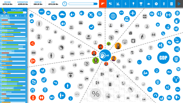 Policies are split into different areas of government such as ‘transport’ and ‘tax’. These areas are key to understanding the layout of the main screen of the game, as each area is a different zone on the main screen background. All of the data regarding tax is in the tax area, for example, and this includes not just policies, but also statistics and situations. Policy icons are grey in color.