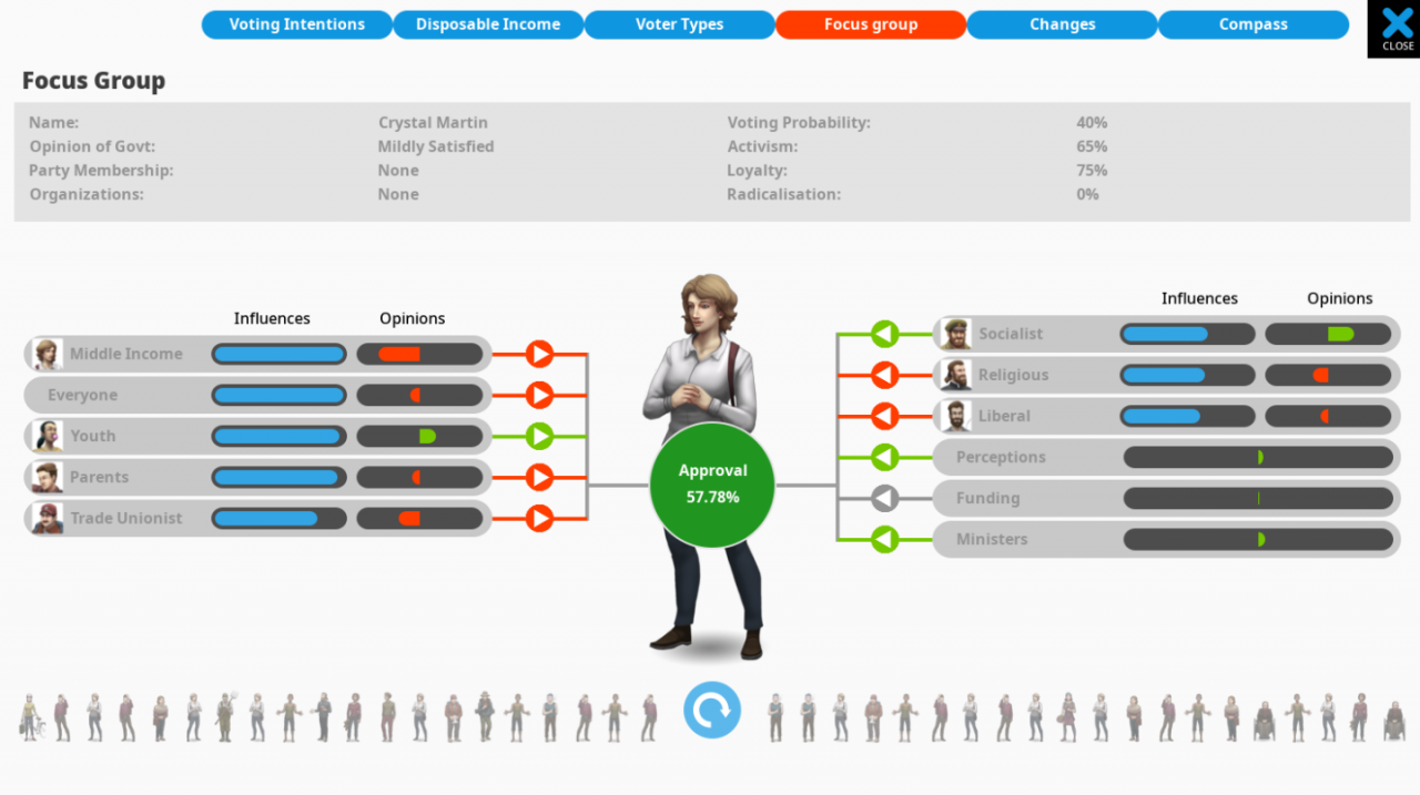 Focus groups are great for understanding how voters make decisions. You can look at a random cross-section of society in the global focus group on the polls screen. Click on each member of the focus group for information about that voter, as well as the voter groups they belong to (with a bar showing how strongly they identify with each group) and the current affect that membership has on their final decision, shown to the right. Be aware of the fact that how much they like or dislike the government does not necessarily mean they will turn out on election day, unless compulsory voting is in force.