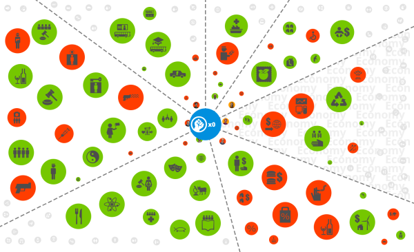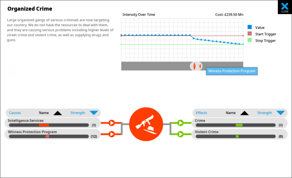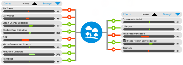 Note that positive/negative are not value judgements, they are just numerical. A positive effect on unemployment is generally a BAD thing. A negative effect on pollution is generally a GOOD thing. By following the path of lines connecting items you can trace back the ultimate causes of change within the country. Maybe poorly funded schools lead to poverty, and poverty leads to crime. Increased crime reduces tourism which affects GDP, which in turn increases unemployment, making poverty even worse… and so on.