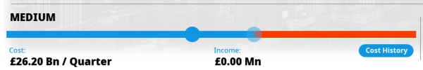 As well as being active or inactive, policies are controlled by an intensity slider. This slider is the strength with which the policy is implemented. For laws, it might represent the severity of the penalty, or the effort put into prosecution. For government spending projects it will represent the amount of coverage and money spent. In many cases, the cost, or income derived from a policy will be strongly linked to the intensity slider. The most obvious example is the tax rate for a tax policy.