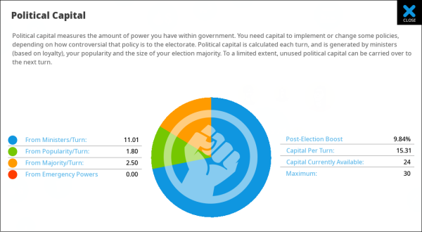 Political capital is generated each turn, based on your popularity, your electoral majority, the loyalty of your ministers, and whether or not emergency powers are in effect in a crisis. You also get a slight boost at the start of a new term. Political capital always seems to be in short supply, so make sure you spend it wisely on the most important policy changes.