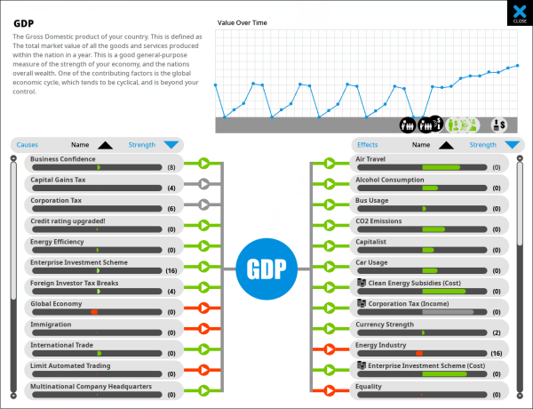 A good example is pollution controls and the environment. If you look at this influence as a ’cause’ for the environment, after you have made changes to the policy (Pollution controls) you can see that the effect is gradually moving from its original position to its final position, as shown by a lighter-colored bar. Most effects are actually instant, and have 0 inertia, but some have a huge amount of it. In practice, this means that you need to plan ahead, and also be aware that you are never simply looking at the outcome of your current policy decisions, there will very often be some inertia or ‘lag’ in the effects of your actions.