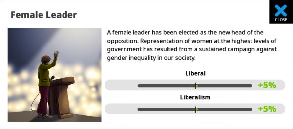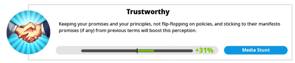 Each voter group maintains its own level of cynicism and this acts as a negative effect on how those voters feel about you. Cynicism is caused by making policy changes that appeal to voters just before an election, or that upset them just after an election. It is also caused by ‘flip-flop’ policy changes where a policy is implemented then quickly reversed. Cynicism eventually tails off and is forgotten. Note that it’s per-voter-group, so socialists may be cynical of you, but not other groups. You can view cynicism as an effect on the voter group’s details screen, or see it listed on the polls screen.