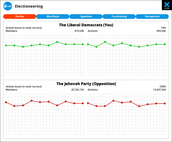 As well as being a target for votes, parties are also represented within the game. Each voter can be a non-party member or a party member. Party members may or may not be activists. Most people do not join either party. If they become very happy with your government, over time they may decide to join your party. All this really means is that they are guaranteed to turn out and vote on Election Day, regardless of how strongly they feel. They are also guaranteed to vote for you. If they become even happier with your government, they may over time sign up as an activist. If voters view you negatively they may join the opposition party. You can see the values for members and activists on the party screen. You can launch this screen from the rosette button near the top right of the main screen.