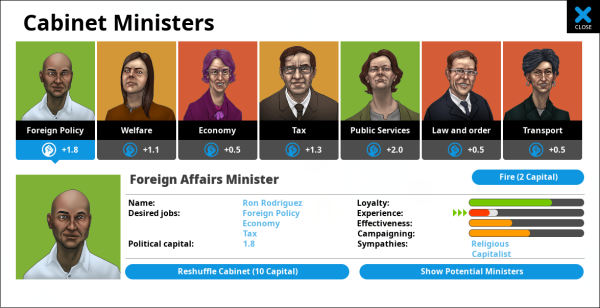 Ministers generate political capital each turn. Some of them are more influential and powerful than others, and thus will generate a larger amount. This enables you to get more legislation passed. The amount of capital they generate is dependent upon their loyalty. A minister’s loyalty may go up or down over time, depending how you run the government. There is also a general inevitable downward trend of loyalty as a minister becomes more jaded and cynical with the government. It’s best to replace people before they get too disloyal. Ministers can resign, (although rarely without warning) and resignations are unpopular.