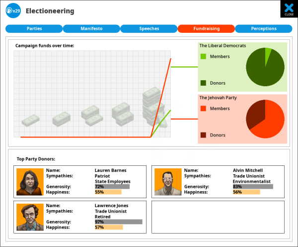 The fundraising screen shows you how much money your party has raised for the election, compared to other parties. Money comes from individual member’s donations, plus some large donations from wealthy individuals. The wealthy donors will have their own ideas concerning policy, and you may occasionally be asked to implement policies in exchange for their continued support