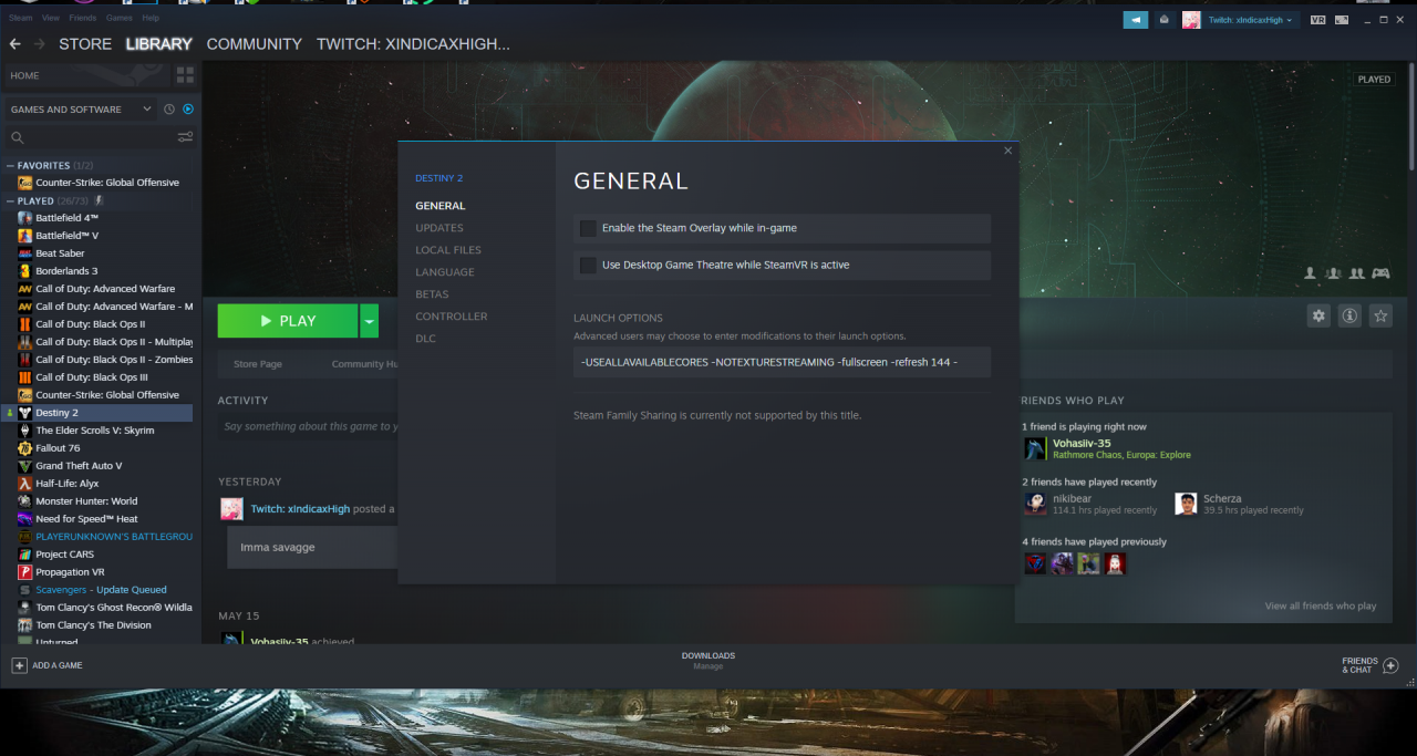 “-USEALLAVAILABLECORES -NOTEXTURESTREAMING -fullscreen -refresh 144 -”