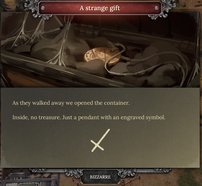 The clues to find out how to activate the secret ending are provided by pendants with symbols that you can find in ruins when exploring until the end with a high-level Explore die. Or when you maintain very good relationships/interactions with an Encampment.