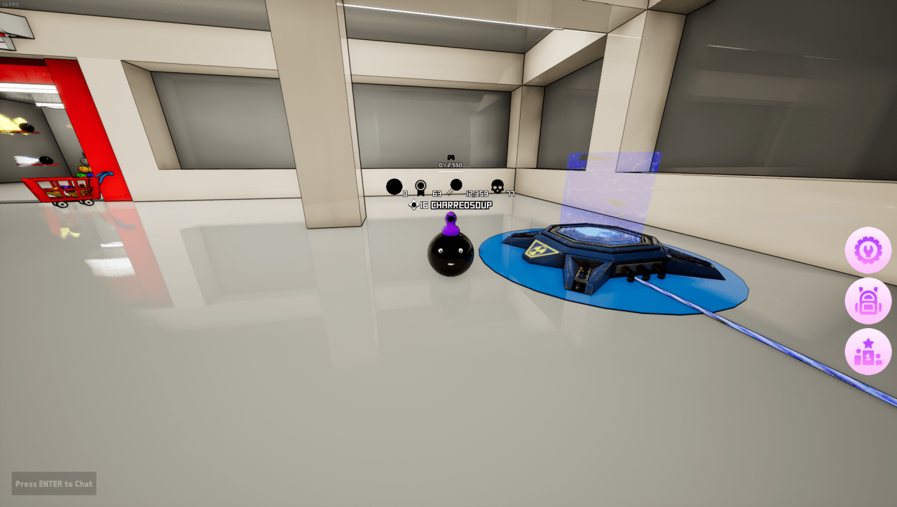 For premium cosmetics like wings or a crown, you can go to the shop behind spawn. Once you enter the shop, a new menu button will appear at the bottom-center of the screen. Reveal your cursor and click the new menu button to open up the shop. Clicking the shopping cart button below any item will open a steam prompt to checkout and confirm your purchase.