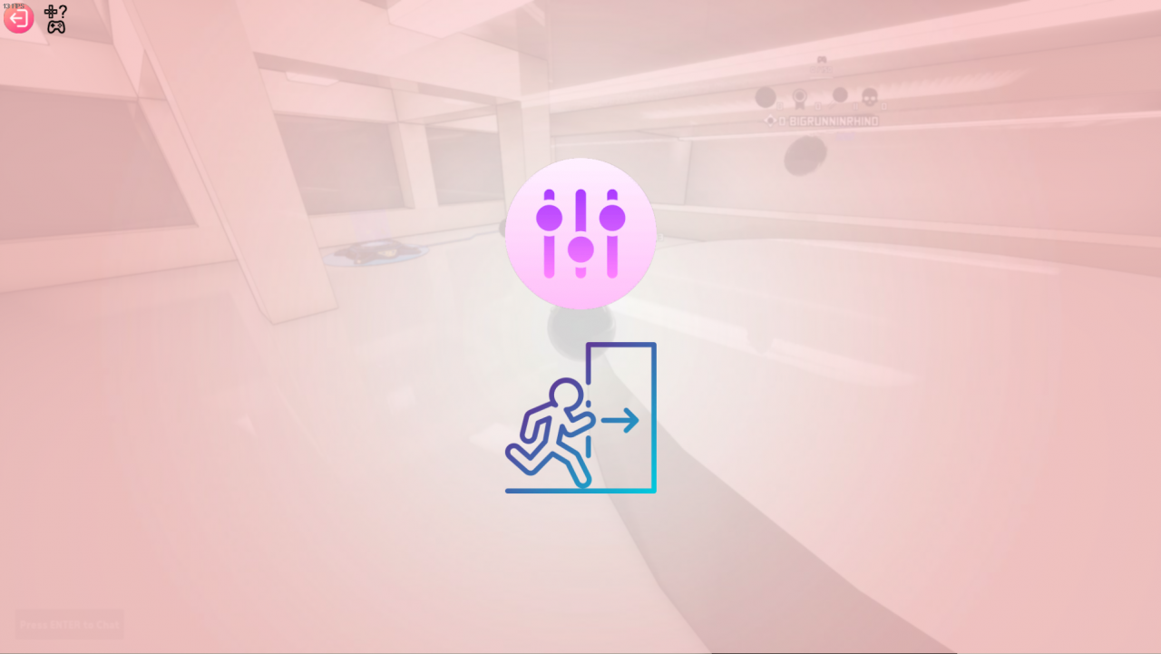 The third button is the settings menu, which requires you to click the big button with pictures of sliders to access the actual game settings. The button below that allows you to exit the server and enter the main menu. In the top-left of this menu, you have a red button that brings you back to the game and a button with a controller & question mark that shows a visual of the controls for keyboard and controller users.