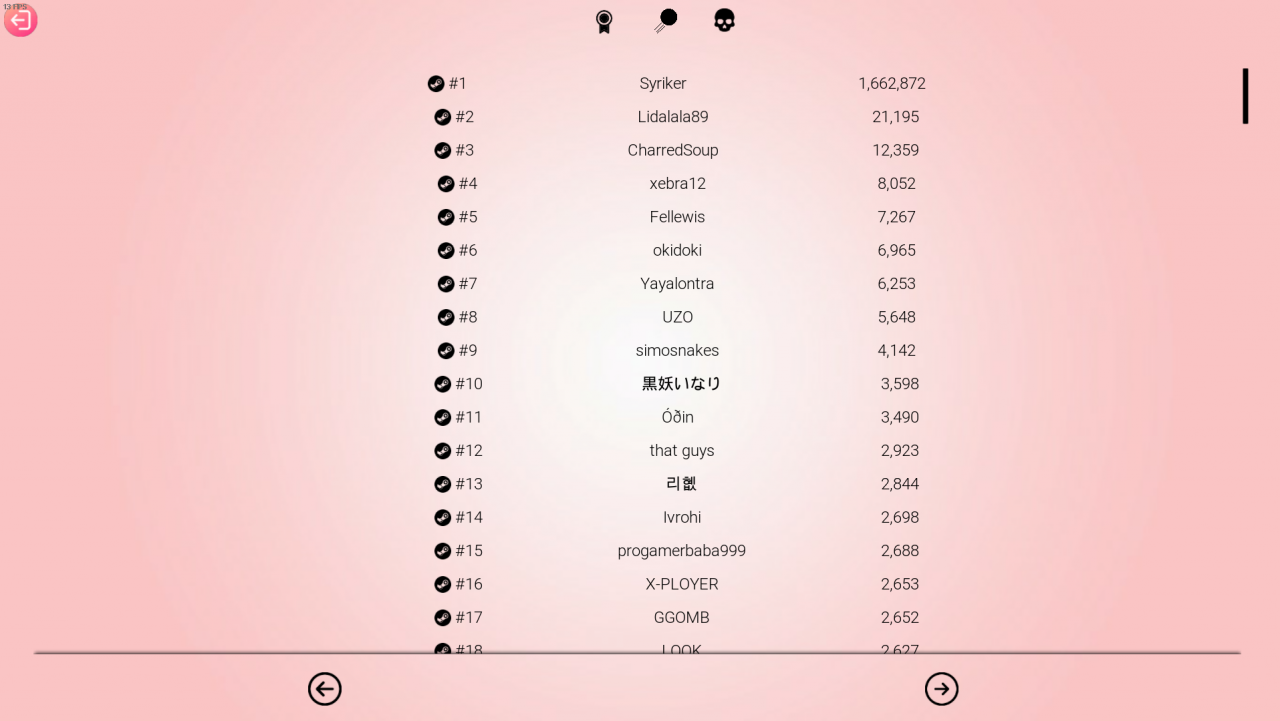 The final menu is the leader-boards. Clicking the icons at the top (badge, ball, and skull), will show you the players with the most score, jumps, and deaths respectfully. Menu shown is jumps.