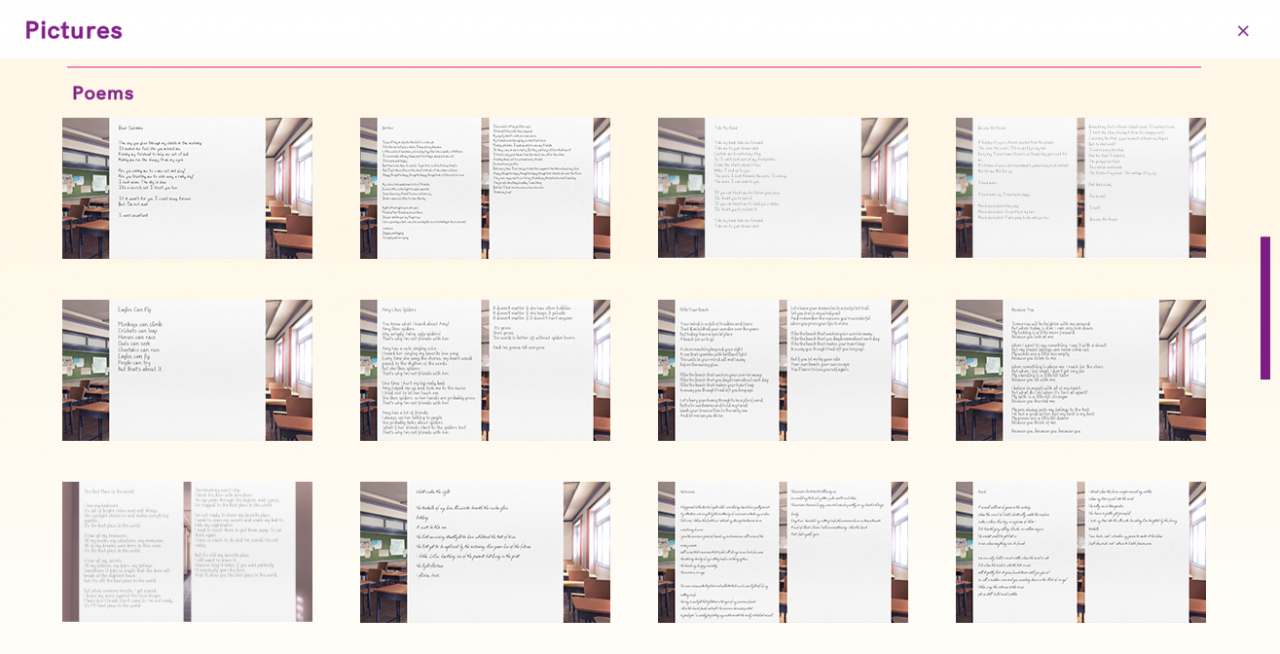 This is by far the most time consuming portion as it’s entirely based on rng. Every time a complete new game is started (from act 1 using reset.sh) the game chooses 3 out of 11 “special poems” that are able to be viewed during act 2. Out of these 11 poems, only 9 count for the pictures, so Happy Thoughts.png and the corrupted Monika image DO NOT COUNT, but will still take up a slot as a “special poem”.