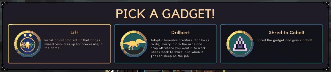 - Choose Lift, it’s the most broken one. It will not only help you to collect resources while you explore and mine, but also the upgrade to give you speed will help you to stay longer on the deep parts without having to leave earlier and defend your dome, but also, you can drop resources and the orbes will take care of it