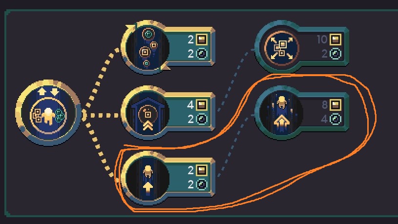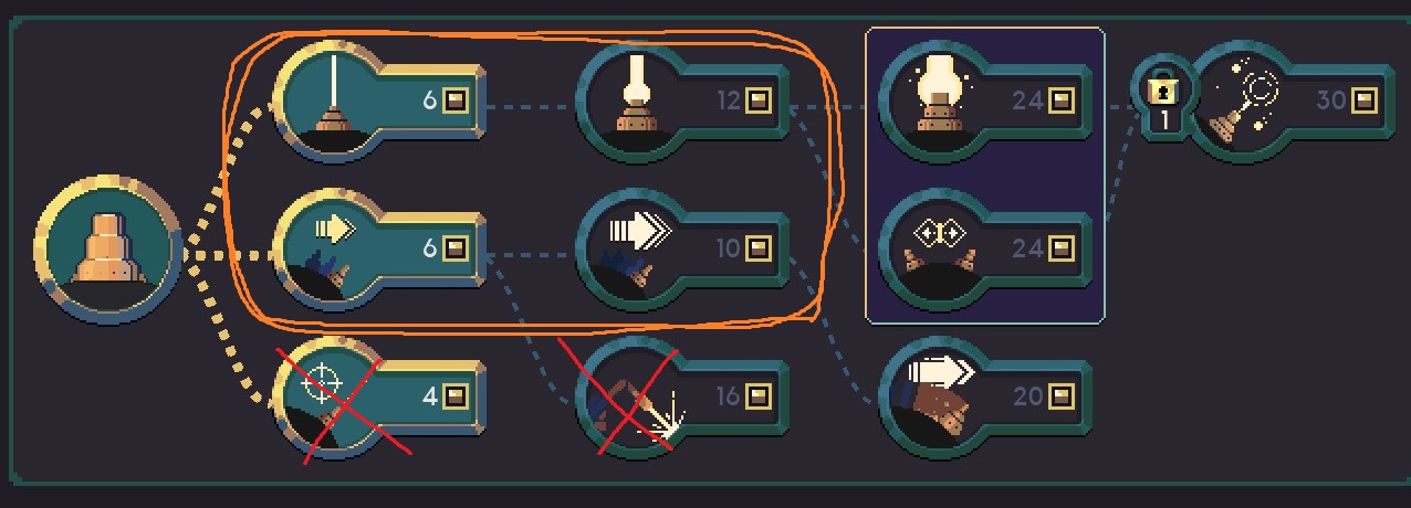 Your first “to complete” line of upgrades would be a mix of the first vertical line of your character, damage you do on your dome and, radar to know when your enemy is close