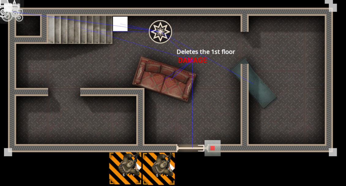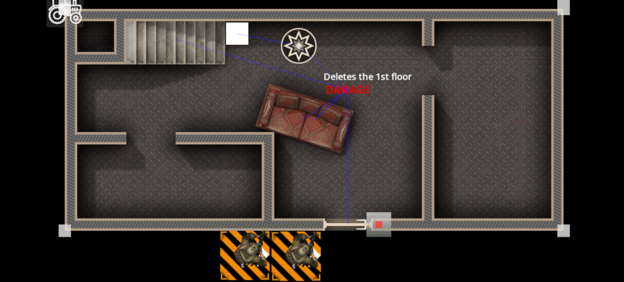 At this point you should be able to destroy the first floor. Start the map, approach the staicase and interact with TLI. The first floor should dematerialise after you destroy the TLI.