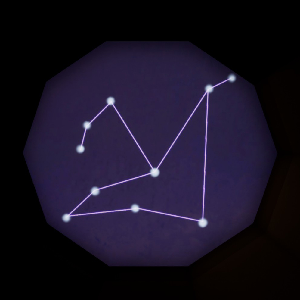Click on the telescope and then use the dial on the right side to focalise on the two stars. Then drag the picture a little to the bottom left to find the full constellation.