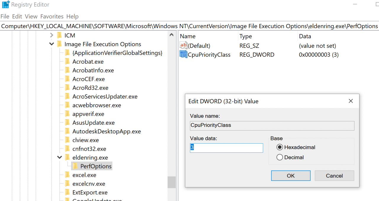 Open CpuPriorityClass and set its value to 3 and its base to hexadecimal