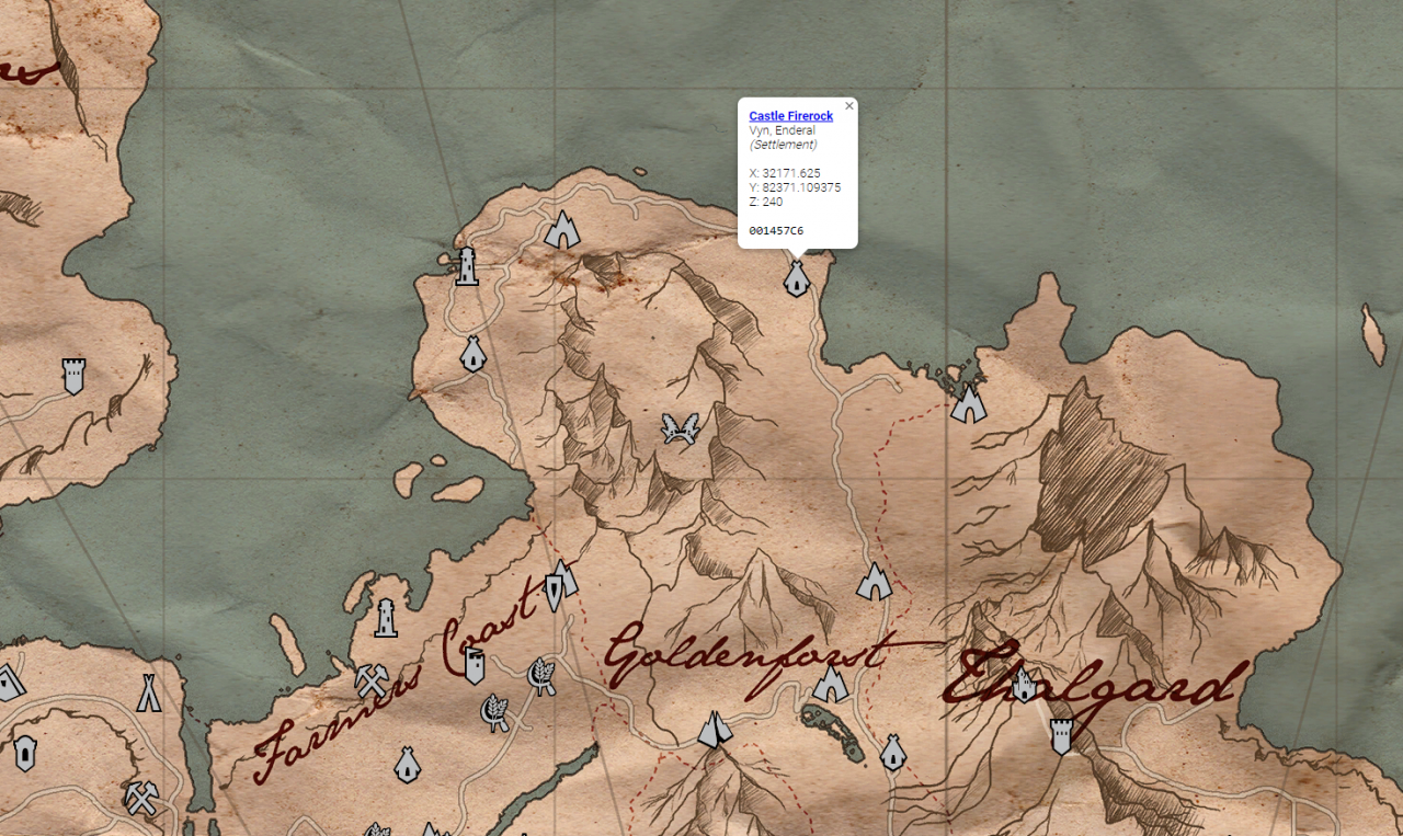 - South of Castle Firerock (Behind a boat at the coast -> At the base of a fallen tree -> On a chest next to a lion statue)