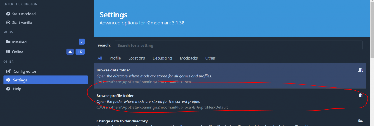 - 2. Next, you’ll need to locate the folder where r2modman is keeping your mods at which can easily be found under settings and Browse profile folder and clicking on the door on the very right.