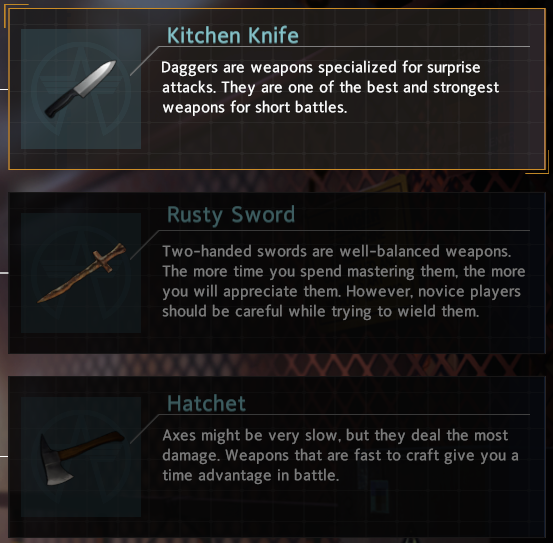 As a quick example, Daggers attack incredibly quickly, but lack a lot of damage that Axes have early on, of which Axes trade for a lower attack speed.