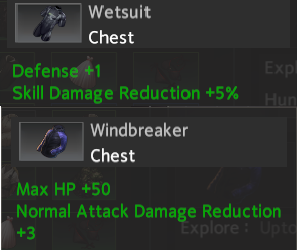 Wetsuit and Windbreaker are both common items, found in different areas of the Island. They’re both Chest piece items, however, as you can see, they differ in stats and fundamental uses.