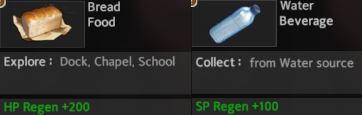 Two good examples of the food items are the two default items that everyone is provided at the start of the game: Bread and Water, health and stamina items, respectively.
