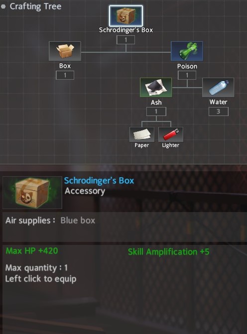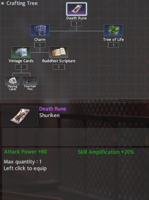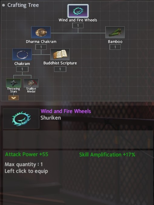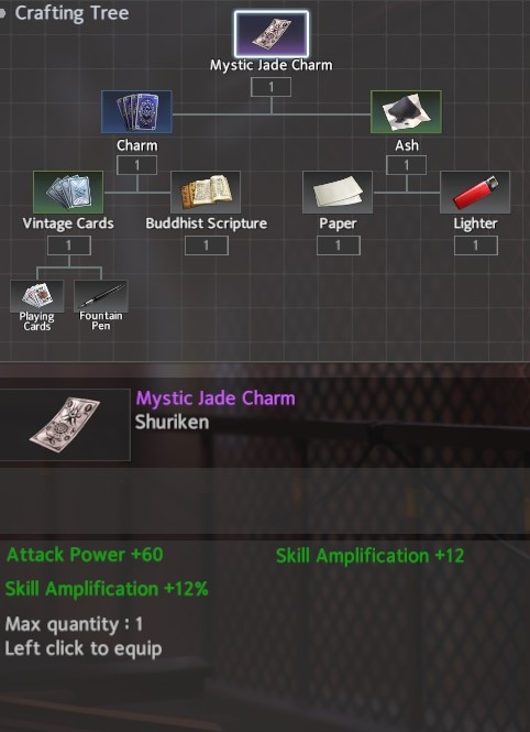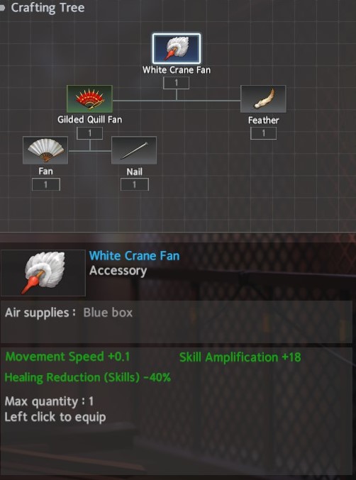 For accessories, I recommend Schrodinger’s Box for Throw Weapon and the White Crane Fan for the Shuriken. Schrodinger’s Box gives a significant boost to HP and can be completed in two areas: Temple / Chapel -> Docks. The White Crane Fan provides the necessary Healing Reduction along with a bit more flat Skill Amp and can be completed in two areas: Avenue <-> Forest / Hospital.