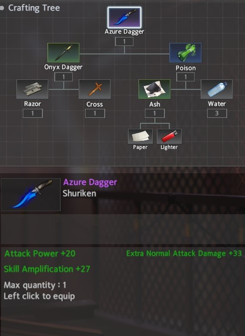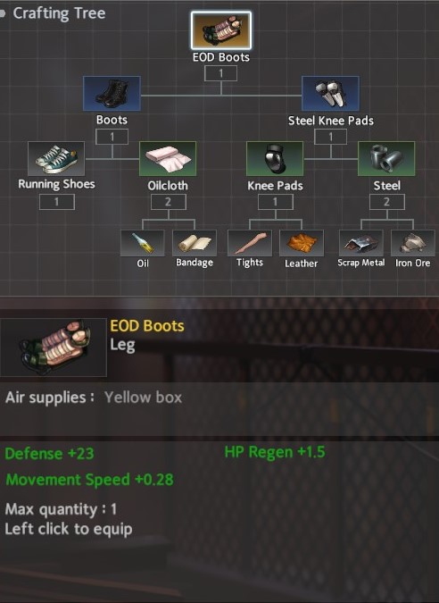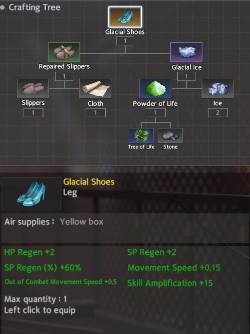 For footwear, I recommend the EOD Boots for Throw Weapon and the Glacial Shoes for Shuriken. The EOD Boots cant be completed in two areas with a lucky Ore drop: Avenue <-> Hospital -> Cemetary / Forest / Hotel. The Glacial Shoes can be completed in two areas as well, but doesn’t need that pesky ore: Avenue <-> Hotel. It does however need Tree of Life which can be found in Hotel.