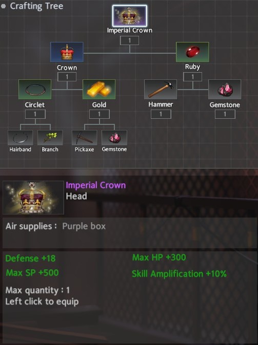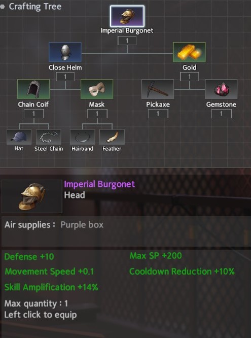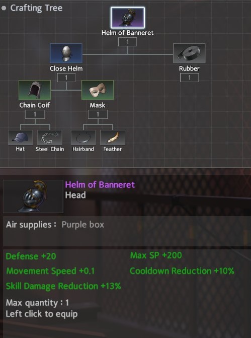 For helms 3 stand out: Imperial Crown, Imperial Burgonet, and the Helm of Banneret. The winner here and my recommendation is the Imperial Crown although the Imperial Burgonet is a close second. They can both be completed in two areas: Pond <-> Cemetary. The third, more defensive option (if you find yourself in against skill heavy characters) is the Helm of the Banneret. It can be completed in three areas Pond <-> Cemetary -> Archery Range / Alley / Docks. The Helm of Banneret and Imperial Burgonet are built from the same blue helm which provides a little diversity, but the Imperial Crown has some much needed HP / Defense as well as SP and Skill Amp. Note that the crown requires 2 gemstones which are required for several prominent accessories, helms and weapons. Just something to keep in mind.