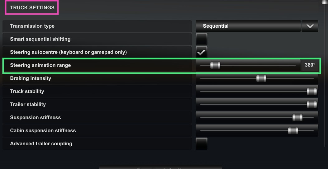 Scroll down to Truck Settings and put the Steering Animation Range = 360Β°