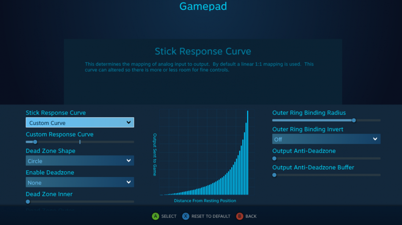 I have an issue though – in the section where we apply the custom curve in my Steam (with latest upgrades etc) the dropdown control for “Stick Response Curve” does not have any options except Linear. I’m using a generic gamepad and although Steam and Windows does recognise it as an Xbox controller could this be why? Could this just be something that my controller doesn’t support? Or have they have removed this from Steam?