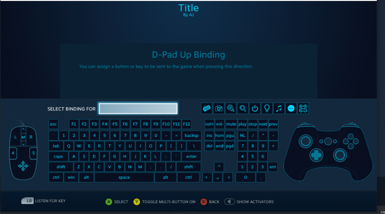 Similarly, for the controller we are making the LB and RB buttons act like Shift 1 and Shift 2. So that, by holding them we can change the function of buttons we press next. - In gamepad settings, at the top, there’s ADD ACTION LAYER and ADD ACTION SET.