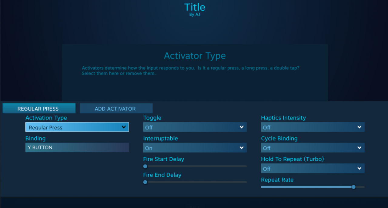 This means that when we u simply click the Y button, ‘J’ on keyboard will be activated for that moment, which is the light horn/flasher. - Now, click on ADD ACTIVATOR and under Activation type select long press.