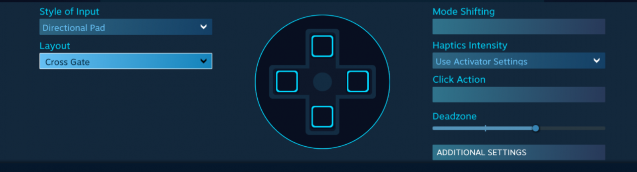 - Click on the RS (joystick move), now under style of input select Directional Pad and for Layout Cross Gate.