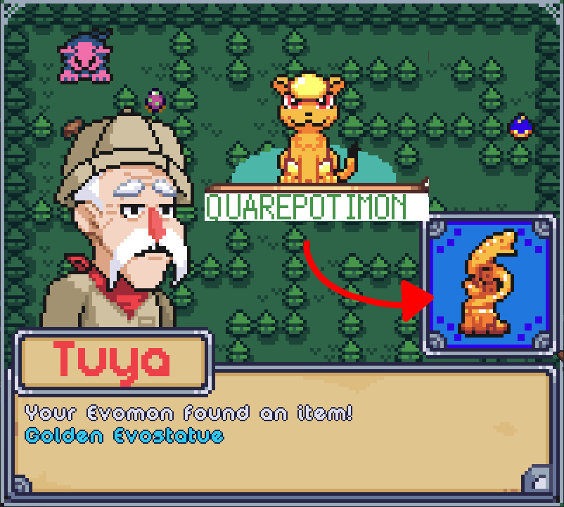 The evomon resulted from the fusion between Quarepotimon and Guiramon while using the item Complete Evostatue, deals more damage in the arena, which is where we are going to get all the xp from.